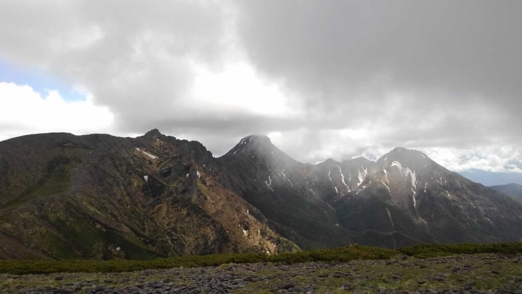 振り返ると北八ヶ岳方面が。根石岳、西天狗、東天狗が見えています。