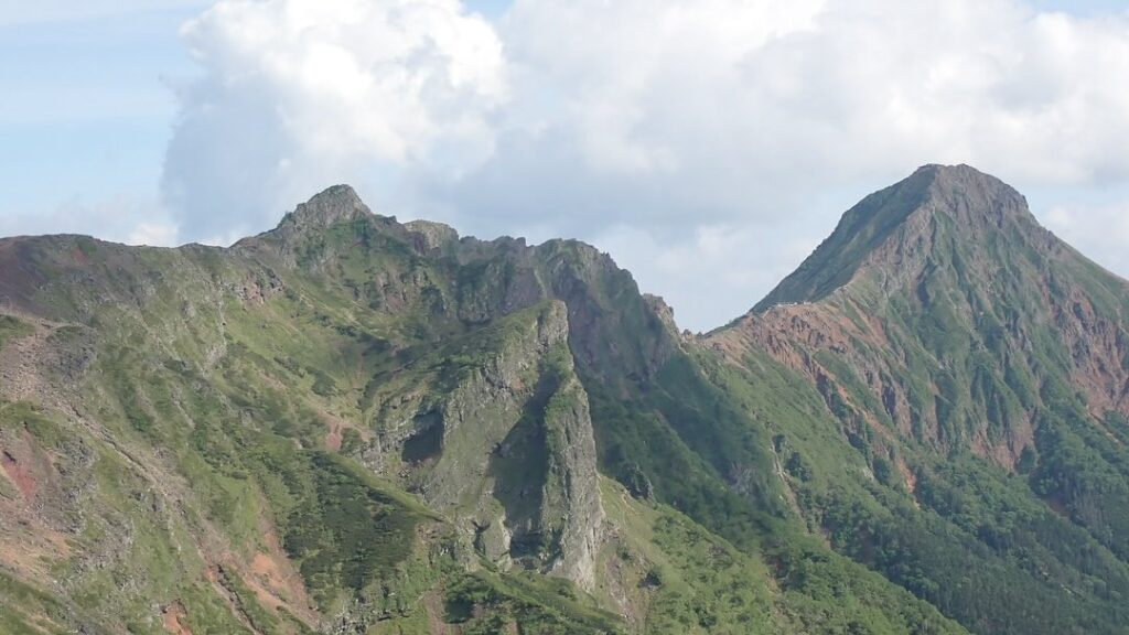 左側の平ら面が多い山が横岳2829m。そして隣が主峰の赤岳2899mになります