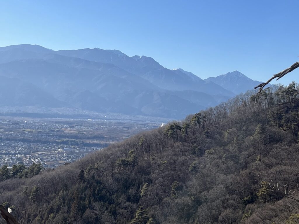 写真の真ん中ほどにある尾根の先にはヤマトタケルの伝承地である酒折宮が位置しています。今回歩く尾根にも1300年前の石積古墳があるのですが、古墳が作られた時代から何層にも重なり合った甲府の町をこの里山から楽しみましょう。このエリアの重要性が感じられる登山になると思います。雰囲気があり好きな里山です。