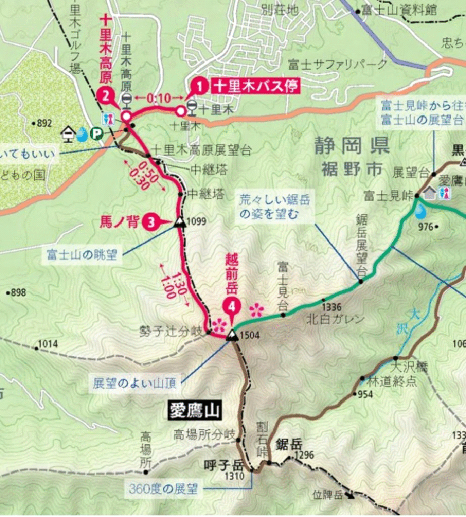 最初はなだらかなルートで富士山を見る展望台など訪れながら標高を上げていきます。