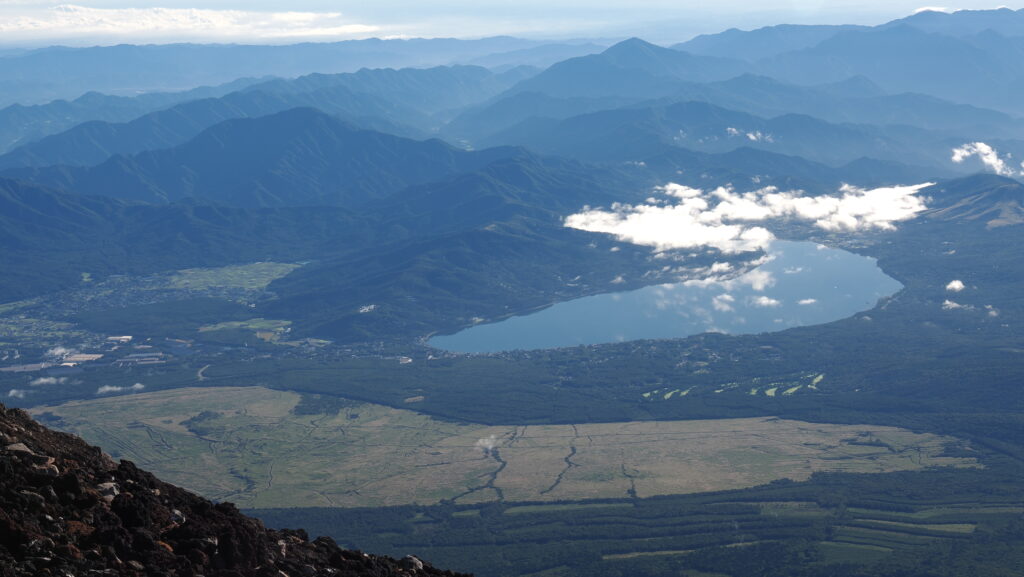 御殿場口から見える富士五湖の山中湖は勾玉のよう